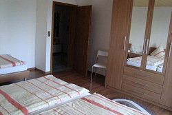 | Das Schlafzimmer bietet Platz für bis zu drei Personen. Ein weiters Bett befindet sich im Wohnzimmer hinter der Sitzgruppe. | ![]() ![]() |